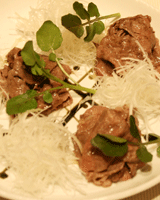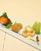 此日式餐厅由土生土长的上海人赵宝珠(Rannie Zhao)任厨师长,其长达18年潜心研制丶烹饪的日式料理为人称道;午丶晚餐均提供“任君食”自助餐,皆包括100多道菜式,价格为RMB238/人。【前菜八寸 Appetizer Hason】含三文鱼寿司丶青鱼籽丶明虾等七道精致小菜,清爽保有海产鲜味;其中蛋糕制作独特,将白煮蛋白与蛋黄分别捣碎清炒,再以方形模具压制,黄丶白分明,口感细腻浓香;以盐水浸渍的白萝卜片卷甜醋浸过的三文鱼,清脆爽口而略带软腴,佐蛋黄酱更增清香。【薄切鲷鱼配柠檬醋沙司 Sea Bream Carpaccio with Ponzu Sauce】冰凉鲜嫩的鲷鱼切成薄片,呈现晶莹剔透的粉红,口感清脆且富嚼劲,搭以葱与胡萝卜泥,更富清香甘美;佐蘸餐厅自制柠檬醋,酸甜滋味令口感更为丰腴。【蒜香烤海螺 Grilled Conch with Garlic Butter Sauce】海螺肉与餐厅自制黄油沙司丶蒜蓉一同焖烧,肉质丰腴细腻丶鲜嫩Q弹,蒜蓉与奶油十分入味,口感倍增鲜美且层次丰富。【嫩煎和牛配柠檬汁 Wagyu Beef Shabu Stick】澳洲和牛微煎后鲜嫩多汁,卷清脆京葱丝并佐蘸柠檬醋,清香酸甜口感令牛肉异常鲜美;京葱丝以冷水冲后,去除多余辣味,保留的脆香令其不辛辣刺鼻;亦可佐甘甜胡萝卜与清新葱末,风味各异。【虾球清汤 Shrimp Ball Clear Soup】明虾蓉与山药泥搅拌后做成虾球,加入鲣鱼汁丶百合炖煮,虾球Q弹爽滑且鲜嫩味美,淡淡的百合味赐予清爽香甜。