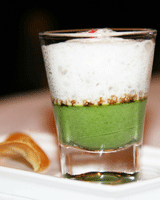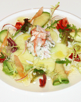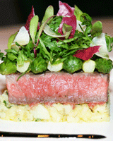 行政主厨黄先生烹饪法国料理长达10年,对食材控管严格,选用食材质量高丶新鲜,而且大部分从国外进口。除单点外,午丶晚餐各提供3种价位的套餐,分别为RMB148丶198丶288及RMB488丶688丶888。【芦笋巴马臣奶油和培根薄脆 Parmesan Cream with Asparagus & Bacon Chip】鸡蛋蒸芦笋盛于透明小玻璃杯底,色泽翠绿,口感细腻,淋少许波特酒,再加入泡沫巴马臣奶油,温热中散发浓郁奶香,鲜美且蕴含波特酒赐予的淡甜;搭脆口的培根薄饼,滋味丰盈令人胃口大开。【青苹果蟹肉色拉佐番茄啫喱 Crabmeat & Green Apple Salad with Tomato Jelly】番茄啫喱衬于盘底,酸脆青苹果片丶洒海盐的幼滑牛油果丶肉质紧实的花蟹肉摆于其上,另以少许莳萝与紫生菜点缀,咸酸滋味中略带甘甜,多元美味予人田园般的清爽。【南瓜奶油汤配带子 Light Pumpkin Cream Soup with Scallop】南瓜打碎后用牛奶熬制,汤汁金黄浓稠,淡淡奶香与南瓜清甜融为一体,圆润怡人;隐藏于汤中的干贝,细嫩感倍增鲜活滋味,整体饱满馥郁且香而不腻。【扒澳洲和牛配马铃薯及田园蔬菜 Pan-fried Australian Wangyu Beef with Crunchy Potatoes & Seasonal Green】精选澳洲和牛西冷牛肉煎得恰到好处,内里粉嫩且可感筋肉相连,肉香浓郁极富嚼劲;土豆泥软糯甘甜并带有微咸滋味;以鸡汤煮过的芦笋丶芝麻菜清爽鲜美;多种美味交错,滋味甚是迷人。【酒渍樱桃佐酸奶酪冰霜配樱桃酒味奶油 Red Wine Cherry with Yogurt Sorbet & Kirsch Cream】以红酒煮过的樱桃滑嫩略带嚼劲,淡甜富有酒精香气;细腻奶油香融合醇厚樱桃酒味;酸奶酪冰凉沁心;曼妙口感里可感开心果的怡人香气,丰盈滋味深受青睐。