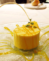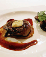此处提供多样法式套餐与单点,但在大厨福井进离开后,口味变得较一般。【香煎鹅肝配以烤无花果及红酒汁 Fresh Fioe Gras】鹅肝香煎后佐以酒醋酱汁,外表微焦香脆丶内里细腻柔滑,配以腌渍的无花果,浓浓的甜味与鹅肝的醇厚滋味,使得鹅肝呈现出多层次的口感风味。【番茄奶油浓汤 Tomato Cream Soup】橘红色的番茄浓汤以奶油裱出树叶图,属摆盘较漂亮的菜色;汤汁浓稠且奶味十足,酸甜适中,但整体口感还是略显单调。主菜【香烤鸭胸肉配以比利时白苦叶菜及鹅肝佐以Marsala沙司 Duck Breast】以红白萝卜搭配鸭胸肉摆盘,使整道菜的色泽和造型显得优雅缤纷。鸭胸肉滑嫩的质地中带着些微弹性,而一旁微甜的Marsala沙司更是调出了鸭肉的鲜与甜,使得口感更加馥郁美味。【芒果酸奶蛋糕配特色芒果干姜沙司 Mango Yogurt Mousse with Mango Ginger Sauce】色泽金黄漂亮并以干姜沙司裱花,口感微甜且芒果味十足,惟整个蛋糕冰镇过头,奶油入口并不能马上融化,若能对温度控制稍加注意,相信口感会更滑爽。此店酒单包括多款红白葡萄酒与调酒。