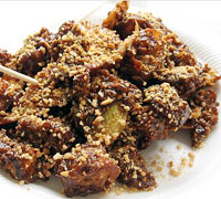 水果啰喳(Fruit Rojak)为马来西亚一地道的小吃,主要食材为水果和蔬菜,如菠萝、芒果、番石榴、小黄瓜、芜菁等。将食材切成小块,再淋上特制的黑色酱汁,最后洒上炒过的花生粉或花生粒,虽然卖相不佳,但是滋味异常迷人。脆口清爽的口感,可驱走炎夏暑气,而黑色酱汁味道复杂,甜、咸、辣皆有,与酸甜水果融合成独特异国风味。